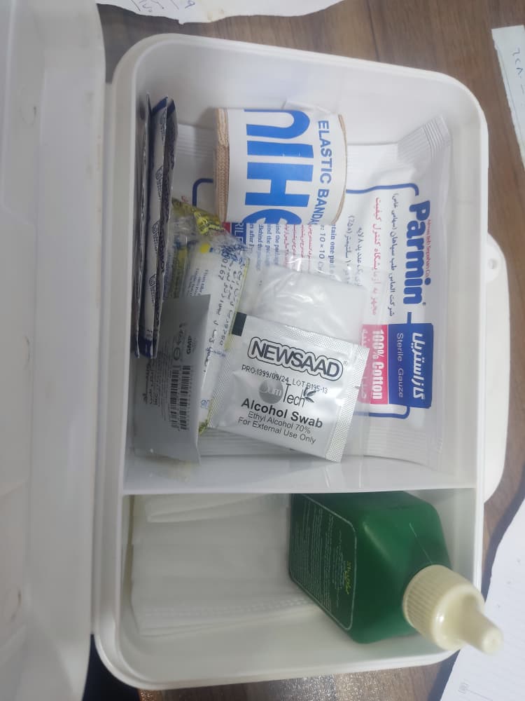 مشخصاتمحتویات جعبه کمکهای اولیه ماسک چسب زخم گاز استریل بتادین باند کشی پد الکلی پانسمان آماده دستمال کاغذی